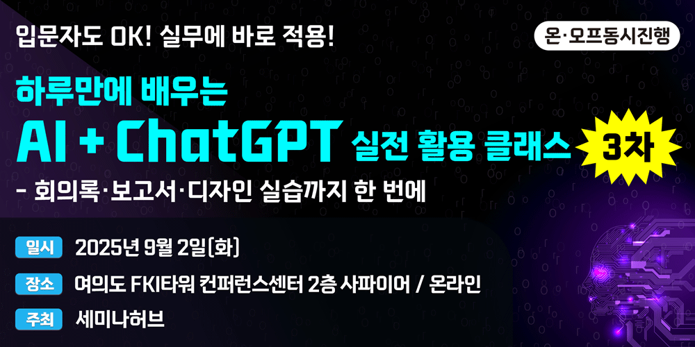 세미나허브는 9월 2일(화), 서울 여의도 FKI타워 컨퍼런스센터에서 ‘하루만에 배우는 AI+ChatGPT 실전 활용 클래스’ 3차 교육을 온·오프라인 동시로 개최한다고 밝혔다.