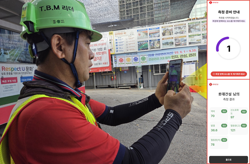 먼저, 롯데건설은 건설사 최초로 근로자들의 건강상태 체크를 위한 ‘비접촉식 생체신호 측정기술’ 어플 개발을 완료하고 전 현장에 9월 중 적용 예정이다.