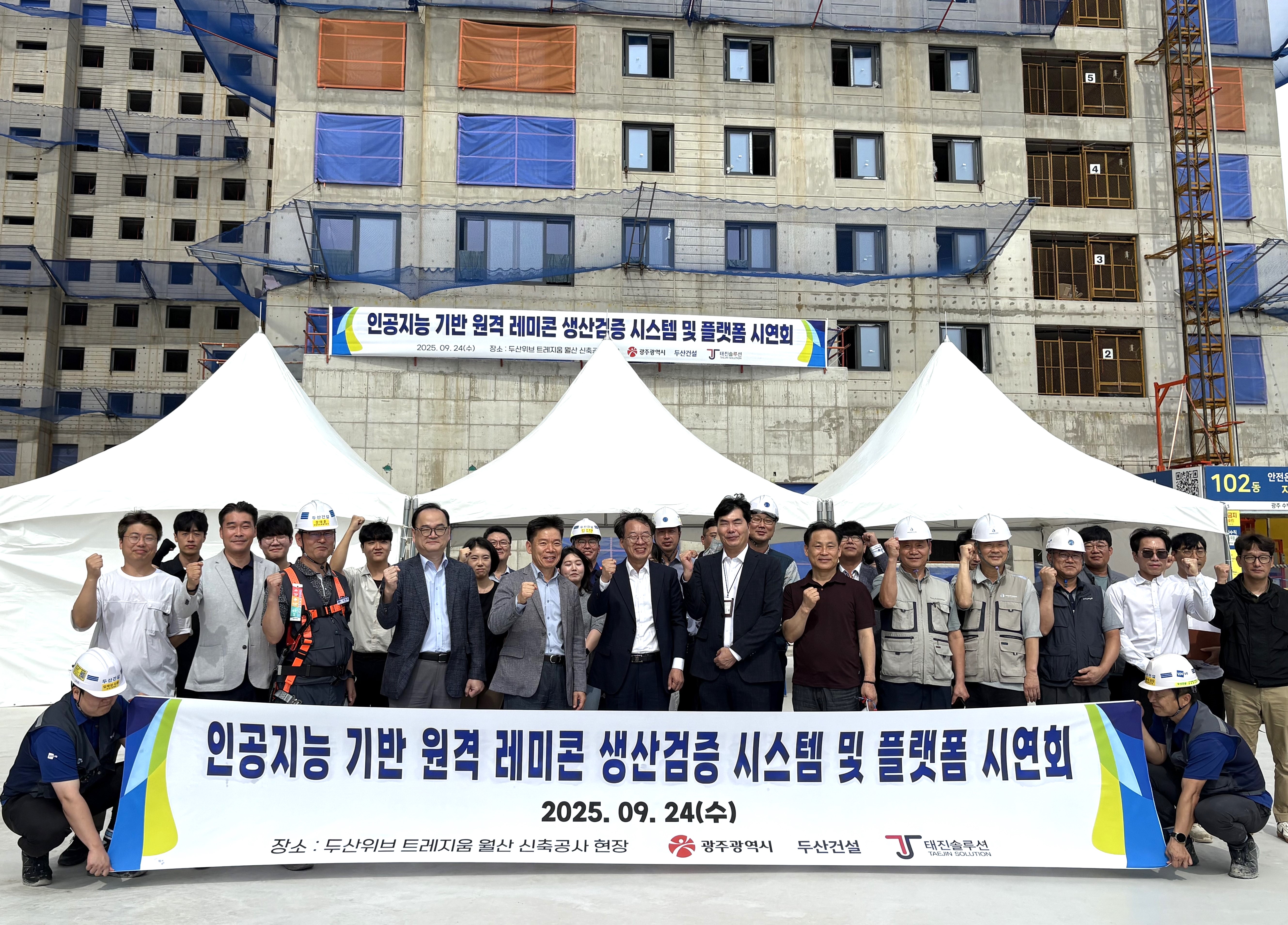 두산건설(대표이사 이정환)은 지난24일 광주광역시 ‘두산위브 트레지움 월산’ 현장에서 건설 품질 신뢰도 향상을 위해 개발한 AI 기반 ‘레미콘 생산검증 시스템’ 시연회를 개최했다고 25일 밝혔다.